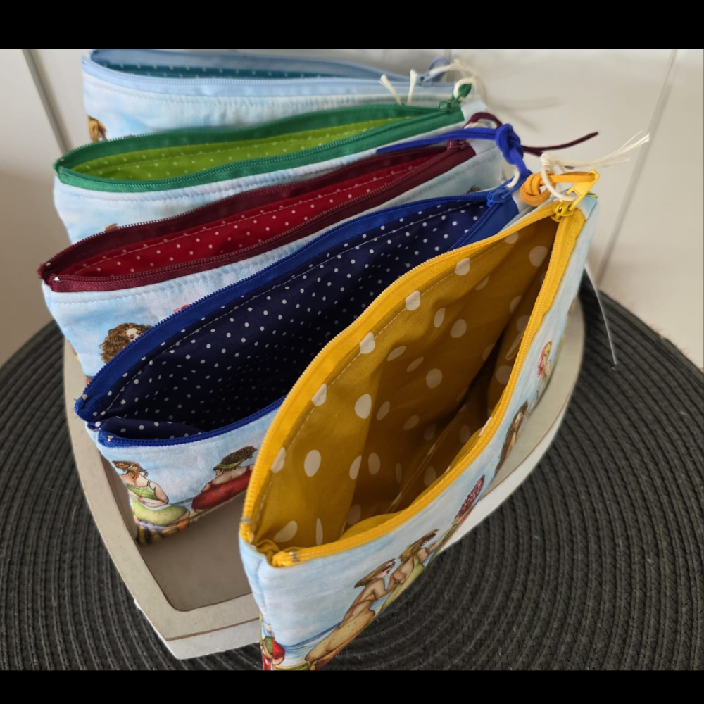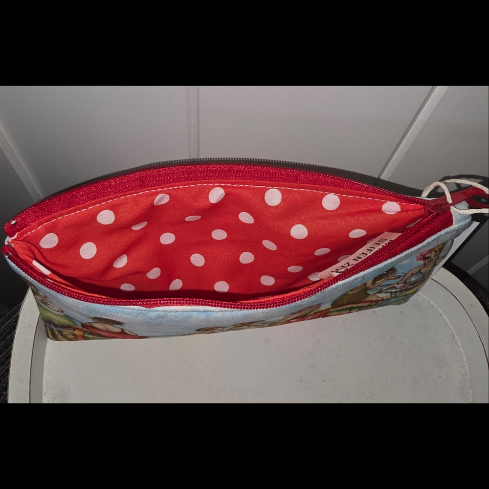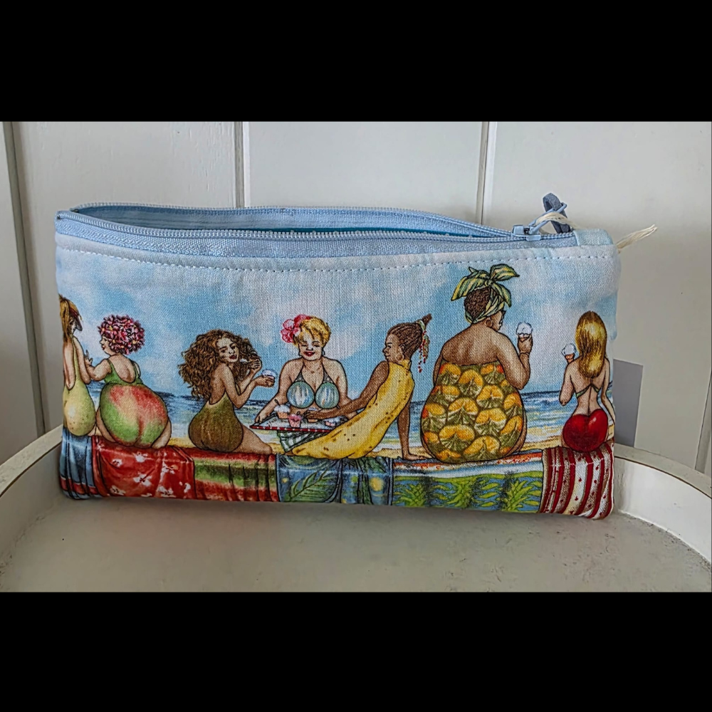 Diese Federmäppchen / Kosmetiktäschchen / Taschenorganizer ist außen mit Fruit Ladies-Stoff versehen und innen mit verschiedenen  in weiß gepunkteten Baumwoll Stoff.